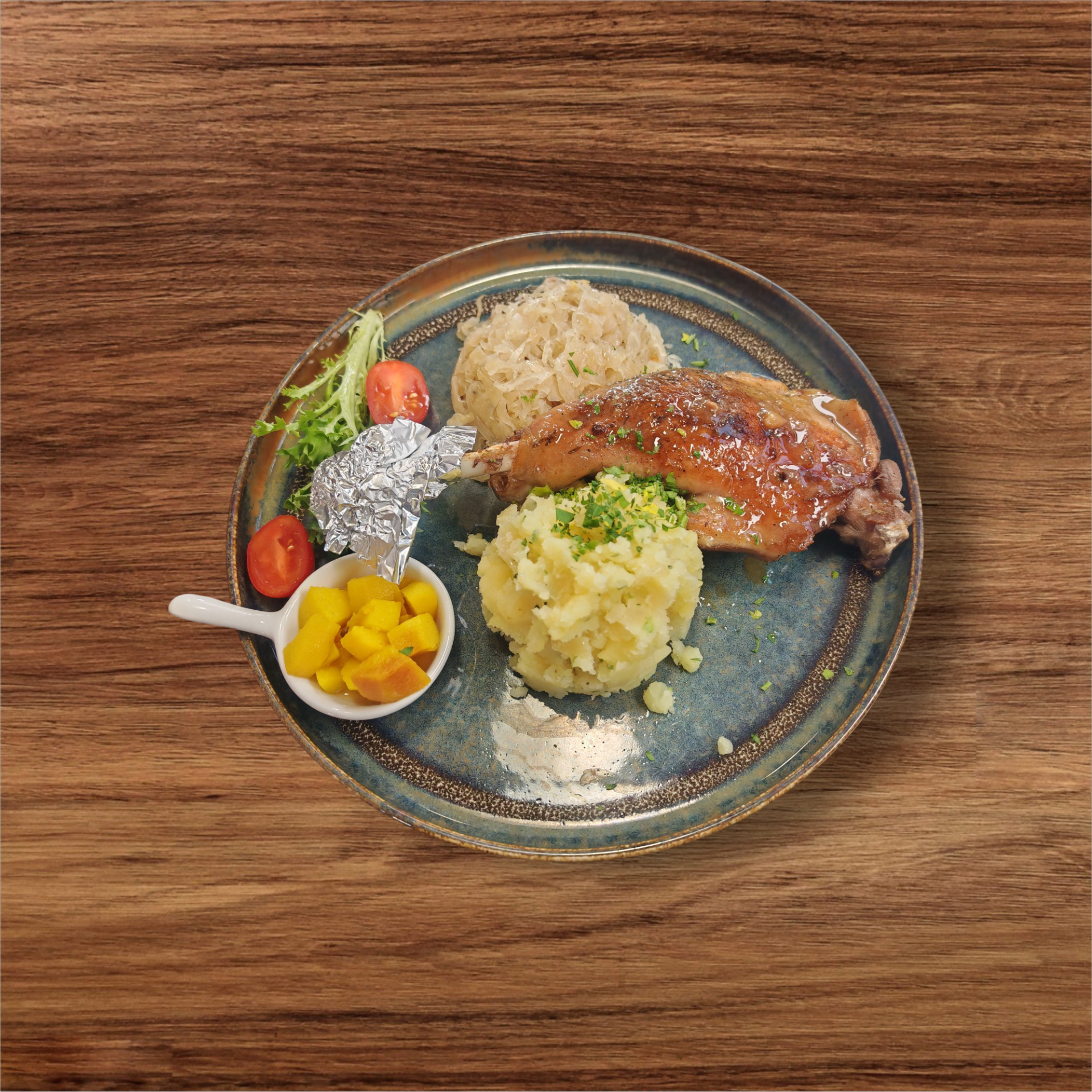Hízott ropogós libacomb pikáns káposztával, hagymás-tört burgonyával, birsalmakompóttal